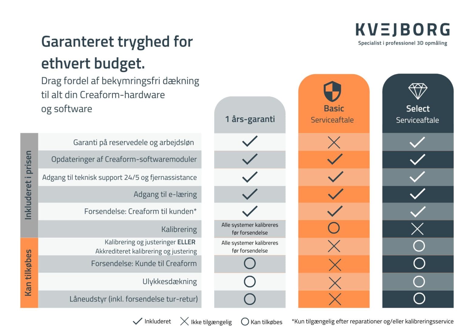 Hos Kvejborg ApS tilbyder forskellige typer af serviceaftaler på dit Creaform-udstyr. Nedenfor har vi samlet en oversigt over, hvad vores tre typer af serviceaftaler indebærer.